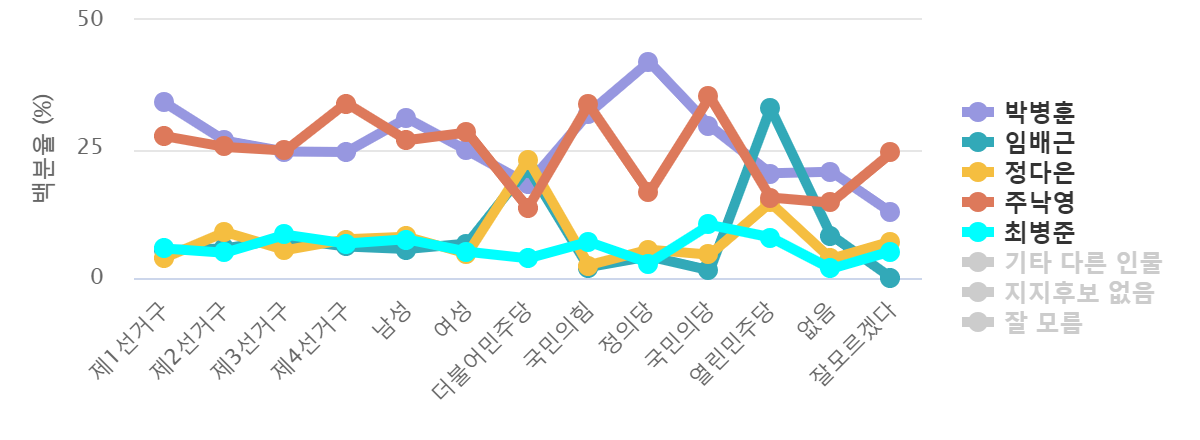 Áö¿ªº° ÀÀ´ä¿¡¼ "Á¦1¼±°Å±¸"Áö¿ªÀº¡¸¹Úº´ÈÆ¡¹(34%),¡¸ÁÖ³«¿µ¡¹(27.5%),¡¸ÁöÁöÈĺ¸ ¾øÀ½¡¹(14.9%)À̸ç, "Á¦2¼±°Å±¸"Áö¿ªÀº¡¸¹Úº´ÈÆ¡¹(26.6%),¡¸ÁÖ³«¿µ¡¹(25.4%),¡¸ÁöÁöÈĺ¸ ¾øÀ½¡¹(12.9%), "Á¦3¼±°Å±¸"Áö¿ªÀº¡¸ÁÖ³«¿µ¡¹(24.7%),¡¸¹Úº´ÈÆ¡¹(24.5%),¡¸ÁöÁöÈĺ¸ ¾øÀ½¡¹(15.9%), "Á¦4¼±°Å±¸"Áö¿ªÀº¡¸ÁÖ³«¿µ¡¹(33.9%),¡¸¹Úº´ÈÆ¡¹(24.4%),¡¸ÁöÁöÈĺ¸ ¾øÀ½¡¹(13%)°¡ ±â·ÏµÇ¾ú´Ù.