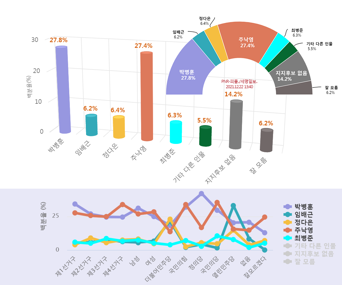 ¾ð·Ð»ç ¼¼¸íÀϺ¸/¹Ì·¡Çѱ¹¿¬±¸¼Ò ÀÇ·Ú·Î 12¿ù 20ÀÏ~21ÀϱîÁö ÀÌÆ²°£ ½Ç½ÃÇÏ¿© 22ÀÏ ¹ßÇ¥ÇÑ °æÁÖ½ÃÀå Èĺ¸ ÁöÁöµµ¸¦ ¹¯´Â Á¶»ç¿¡¼ ¹Úº´ÈÆ Àü °æºÏµµÀÇȸ ¿î¿µÀ§¿øÀåÀ» ÁöÁöÇÑ´Ù´Â ÀÀ´äÀÌ 27.8%, ÁÖ³«¿µ °æÁÖ½ÃÀåÀ» ÁöÁöÇÑ´Ù´Â ÀÀ´äÀÌ 27.4%·Î, ¹Úº´ÈÆ Àü À§¿øÀå°ú ÁÖ³«¿µ ½ÃÀåÀÌ ºÒ°ú 0.4%Æ÷ÀÎÆ® Â÷ÀÌ·Î ÃÊÁ¢ÀüÀ» ¹úÀÌ´Â °ÍÀ¸·Î ³ªÅ¸³µ´Ù. µÚ¸¦ À̾î Á¤´ÙÀº Çö ´õºÒ¾î¹ÎÁÖ´ç °æÁÖÁö¿ª À§¿øÀåÀÌ 6.4%·Î 3À§, ÃÖº´ÁØ °æºÏµµÀÇ¿øÀÌ 6.3%·Î 4À§, ÀÓ¹è±Ù Àü ´õºÒ¾î¹ÎÁÖ´ç Á¤Ã¥À§ ºÎÀÇÀåÀÌ 6.2%·Î 5À§¸¦ ÇÏ´Â °ÍÀ¸·Î ±â·ÏµÇ¾ú´Ù.