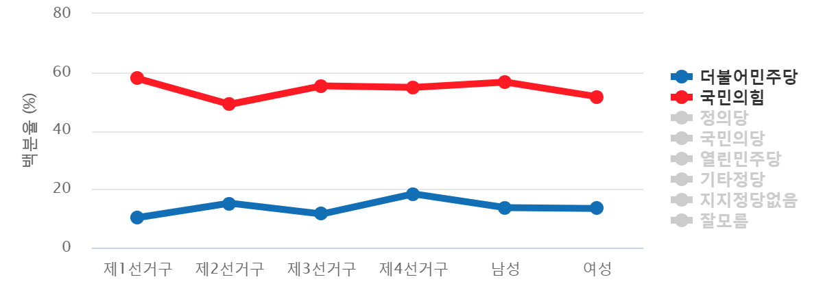 Áö¿ªº° ÀÀ´ä¿¡¼ "Á¦1¼±°Å±¸"Áö¿ªÀº¡¸±¹¹ÎÀÇÈû¡¹(57.8%),¡¸ÁöÁöÁ¤´ç¾øÀ½¡¹(12%),¡¸´õºÒ¾î¹ÎÁִ硹(10.3%)À̸ç, "Á¦2¼±°Å±¸"Áö¿ªÀº¡¸±¹¹ÎÀÇÈû¡¹(49%),¡¸´õºÒ¾î¹ÎÁִ硹(15.2%),¡¸±¹¹ÎÀǴ硹(15%), "Á¦3¼±°Å±¸"Áö¿ªÀº¡¸±¹¹ÎÀÇÈû¡¹(55.3%),¡¸´õºÒ¾î¹ÎÁִ硹(11.5%),¡¸±¹¹ÎÀǴ硹(11.2%), "Á¦4¼±°Å±¸"Áö¿ªÀº¡¸±¹¹ÎÀÇÈû¡¹(54.8%),¡¸´õºÒ¾î¹ÎÁִ硹(18.4%),¡¸ÁöÁöÁ¤´ç¾øÀ½¡¹(9.1%)°¡ ±â·ÏµÇ¾ú´Ù.
