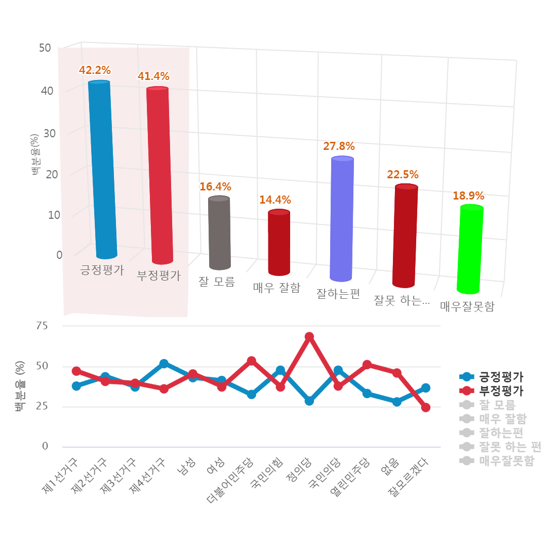 Áö¿ªº° ÀÀ´ä¿¡¼ "Á¦1¼±°Å±¸"Áö¿ªÀº¡¸ºÎÁ¤Æò°¡¡¹(47.1%),¡¸±àÁ¤Æò°¡¡¹(38%),¡¸ÀßÇÏ´ÂÆí¡¹(26.2%)À̸ç, "Á¦2¼±°Å±¸"Áö¿ªÀº¡¸±àÁ¤Æò°¡¡¹(43.8%),¡¸ºÎÁ¤Æò°¡¡¹(40.7%),¡¸ÀßÇÏ´ÂÆí¡¹(29.2%), "Á¦3¼±°Å±¸"Áö¿ªÀº¡¸ºÎÁ¤Æò°¡¡¹(39.7%),¡¸±àÁ¤Æò°¡¡¹(37.5%),¡¸ÀßÇÏ´ÂÆí¡¹(25.3%), "Á¦4¼±°Å±¸"Áö¿ªÀº¡¸±àÁ¤Æò°¡¡¹(52%),¡¸ºÎÁ¤Æò°¡¡¹(36.1%),¡¸ÀßÇÏ´ÂÆí¡¹(31.3%)°¡ ±â·ÏµÇ¾ú´Ù.