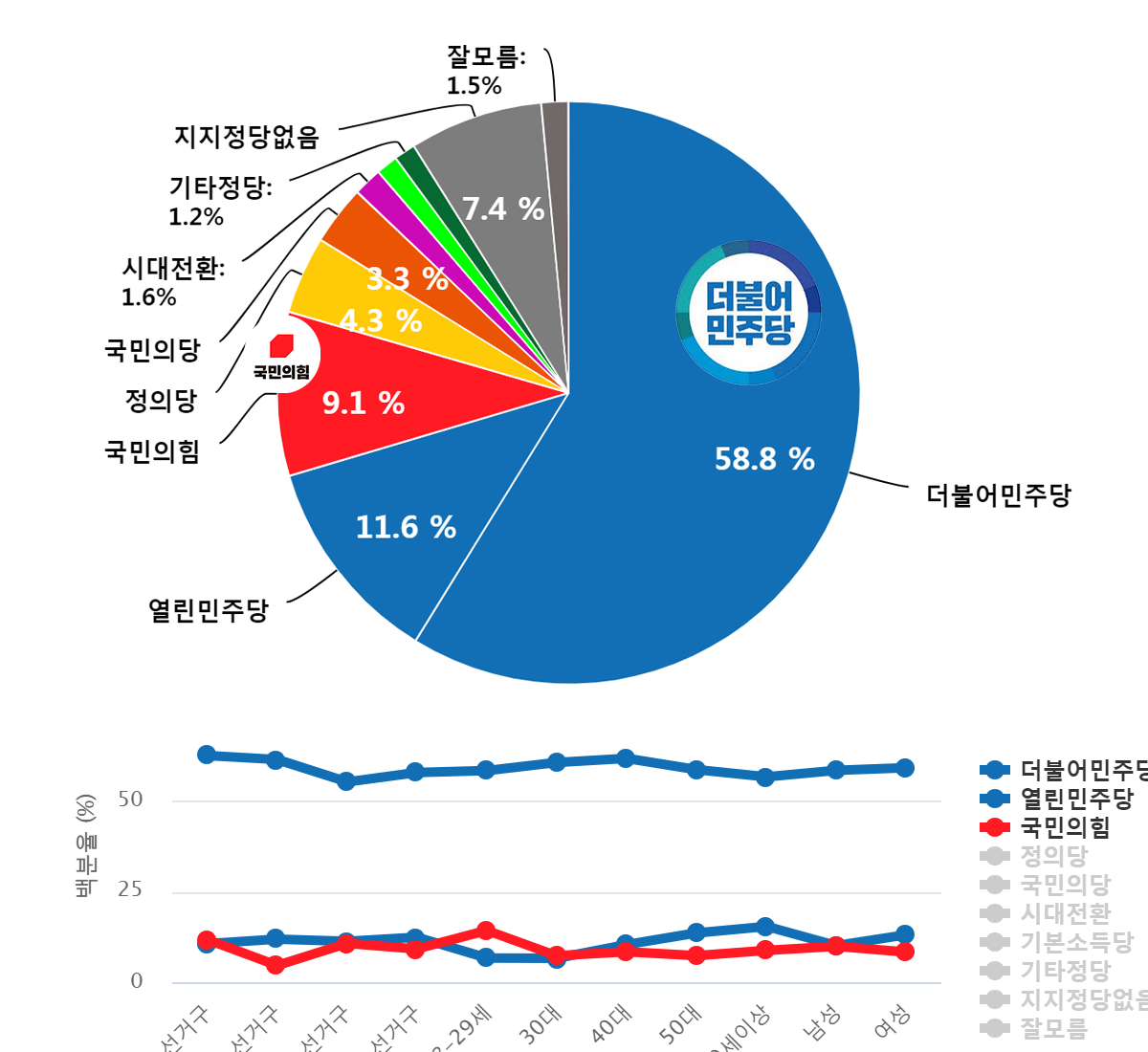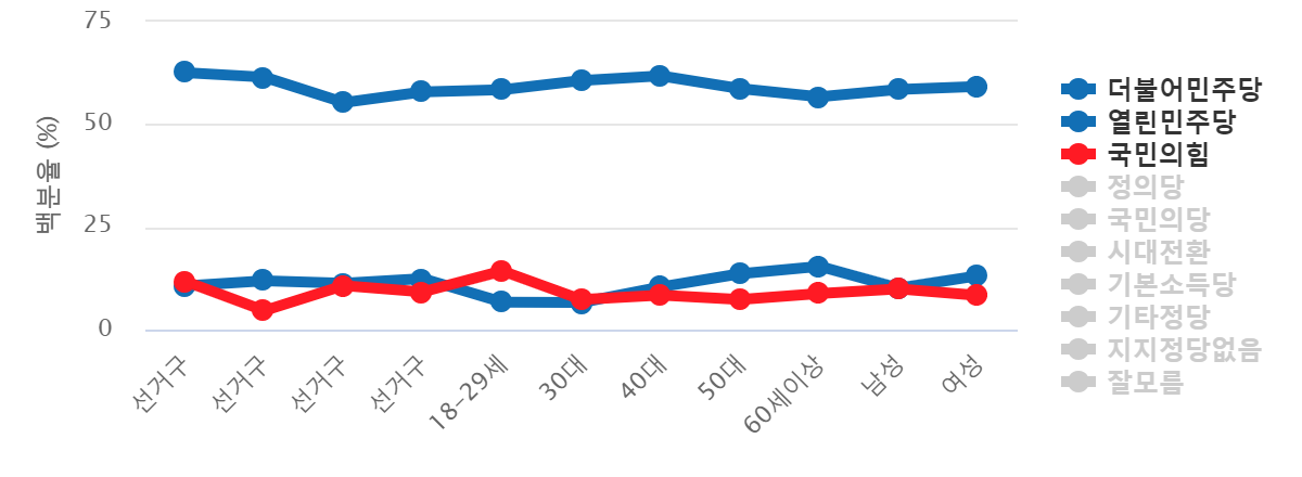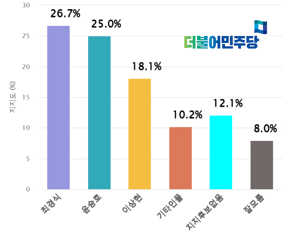°ÀÓÁØ Çö ±º»ê½ÃÀåÀº ½Ã´ëÀüȯ(45.9%), ´õºÒ¾î¹ÎÁÖ´ç(38%), 18-29¼¼(37%), 3¼±°Å±¸(36.4%), 2¼±°Å±¸(34%)¼øÀ¸·Î ³ôÀº ÁöÁö¸¦ ¹ÞÀ¸¸ç, ¹®ÅÃ±Ô Çö ¹ÎÁÖ´ç ÀüºÏµµ´ç ºÎÀ§¿øÀåÀº 50´ë(26.2%), ½Ã´ëÀüȯ(24.5%), ´õºÒ¾î¹ÎÁÖ´ç(23.3%), 3¼±°Å±¸(23%), ¿©¼º(22.5%)¼øÀ¸·Î , ¼µ¿¼® Àü È£¿ø´ë ÇàÁ¤Çаú ±³¼ö´Â ±¹¹ÎÀÇ´ç(24.2%), 60¼¼ÀÌ»ó(18.3%), ±âº»¼Òµæ´ç(16.5%)¼øÀ¸·Î, ¹ÚÀ縸 Àü ÀüºÏµµÀÇȸ ¹ÎÁÖ´ç ¿ø³»´ëÇ¥´Â ±âº»¼Òµæ´ç(16.4%), 40´ë(14.2%), Á¤ÀÇ´ç(14%), 4¼±°Å±¸(12%), ´õºÒ¾î¹ÎÁÖ´ç(11.9%)¼øÀ¸·Î ÁöÁö¸¦ ¹Þ´Â °ÍÀ¸·Î ³ªÅ¸³µ´Ù.