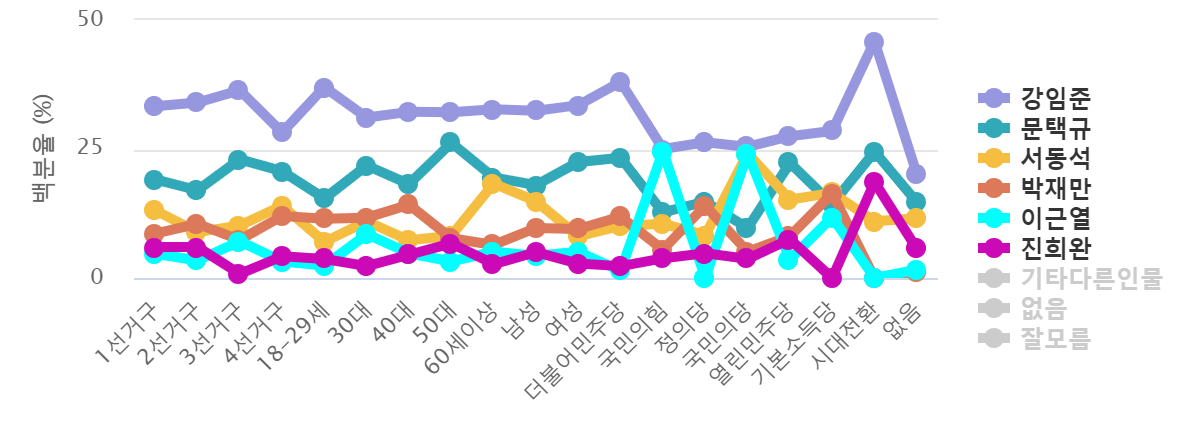 Áö¿ªº° ÀÀ´ä¿¡¼ "1¼±°Å±¸"Áö¿ªÀº¡¸°ÀÓÁØ¡¹(33.3%),¡¸¹®Åñԡ¹(19.1%),¡¸¼µ¿¼®¡¹(13.1%)À̸ç, "2¼±°Å±¸"Áö¿ªÀº¡¸°ÀÓÁØ¡¹(34%),¡¸¹®Åñԡ¹(17%),¡¸À߸𸧡¹(10.5%), "3¼±°Å±¸"Áö¿ªÀº¡¸°ÀÓÁØ¡¹(36.4%),¡¸¹®Åñԡ¹(23%),¡¸¼µ¿¼®¡¹(10.2%), "4¼±°Å±¸"Áö¿ªÀº¡¸°ÀÓÁØ¡¹(28.2%),¡¸¹®Åñԡ¹(20.7%),¡¸¼µ¿¼®¡¹(14%)¸¦ ±â·ÏÇß´Ù.