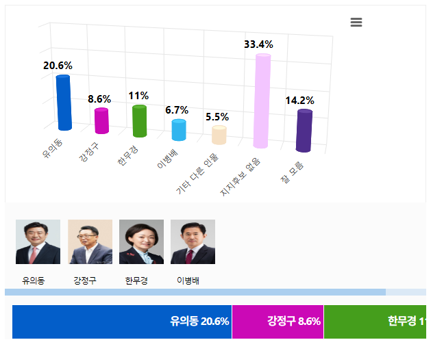 Á¶»ç±â°ü ¸ð³ëÄ¿¹Â´ÏÄÉÀ̼ÇÁî(¸ð³ë¸®¼Ä¡)°¡ 9¿ù 23ÀÏ¿¡¼ 24ÀϱîÁö ÀÌÆ²°£ ½Ç½ÃÇÏ¿© 28ÀÏ ¹ßÇ¥ÇÑ ¡¸±¹¹ÎÀÇÈû ÆòÅýÃÀå Èĺ¸ÁöÁöµµ¡¹¸¦ ¹¯´Â Á¶»ç¿¡¼ ¡¸À¯Àǵ¿¡¹È帰¡ 20.6%¸¦ ±â·ÏÇÏ¿© 2À§ ¡¸Çѹ«°æ¡¹Èĺ¸(11%)¿¡ 9.6%p Â÷ÀÌ·Î ¾Õ¼ ³ª°¡¸ç, µÚ¸¦ ÀÌ¾î ¡¸°Á¤±¸¡¹Èĺ¸ 8.6%, ¡¸À̺´¹è¡¹Èĺ¸ 6.7%¸¦ ±â·ÏÇÏ¿´´Ù.